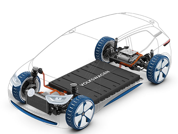 En la disposición de los componentes en el vehículo, ha prevalecido la llamada arquitectura de "patineta". Esta configuración se le denomina así, ya que aloja la batería esté entre los ejes en la parte inferior, el motor eléctrico y la electrónica de potencia en el eje delantero y/o trasero. Esto permite que la carrocería se desliza sobre estos elementos, por así decirlo. Tal arquitectura debajo del piso debería permitir una utilización de espacio ligeramente mejor que en vehículos con motor de combustión interna que requieren alojar una infinidad de piezas.