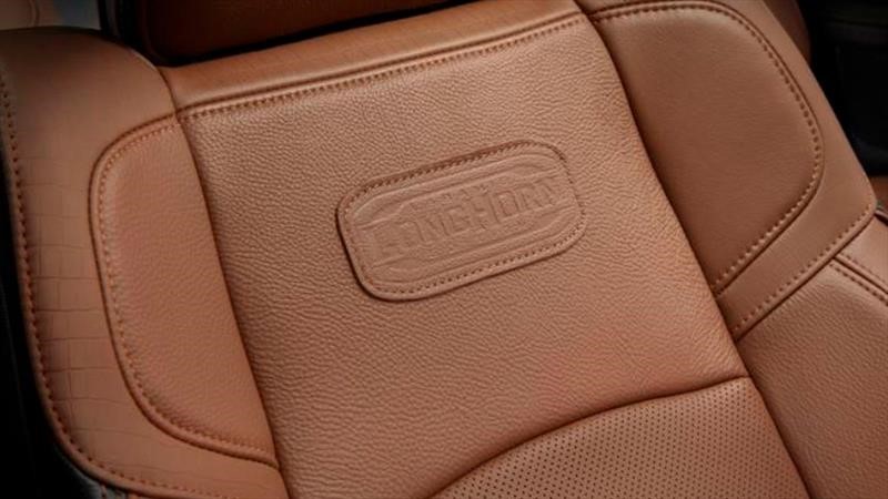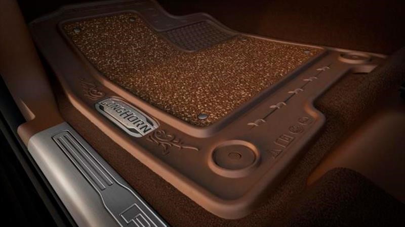 Los asientos se encuentran revestidos en piel color café y el interior cuenta con insertos de aluminio en color ocre, con el distintivo de “Longhorn” ubicado en los tapetes, en el descansabrazo y en el clúster de instrumentos.