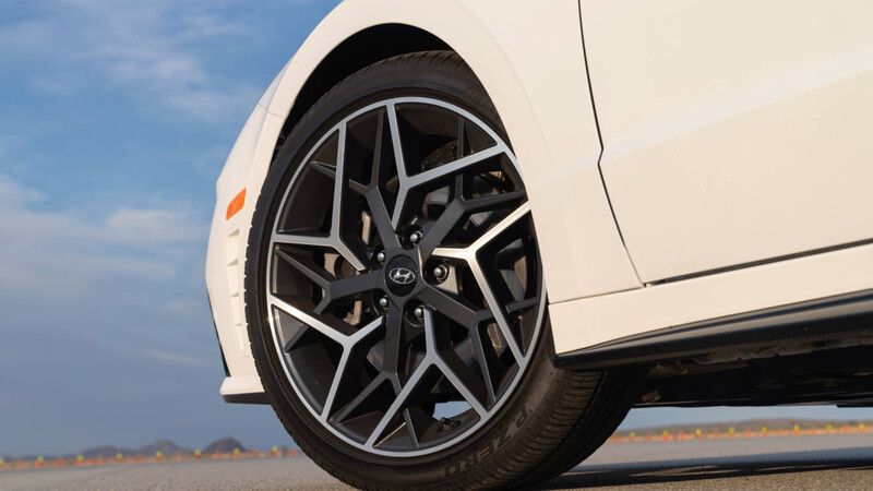 En la silueta podemos ver llantas de 19 pulgadas de diseño propio y el doble tonalidad, y faldones laterales más agresivos, mientras que en la zaga destacan las cuatro salidas de escape, una fascia trasera modificada para remarcar aún más el nuevo difusor negro, y el spoiler existente en el Sonata se vuelve negro para remarcar el concepto deportivo del N Line.