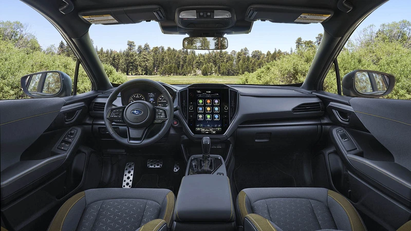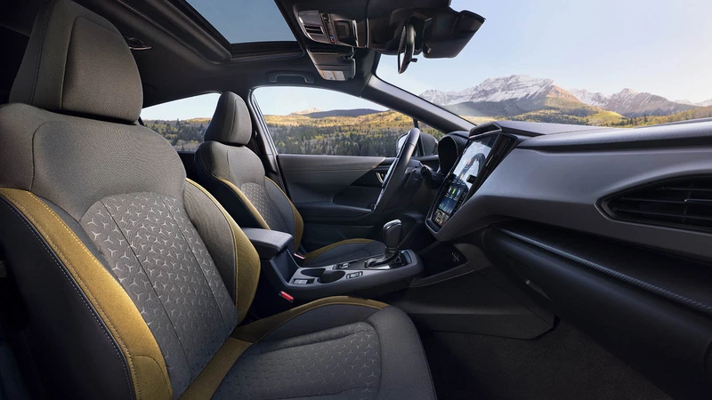 El interior del Crosstrek es prácticamente el mismo que el de Outback y WRX, solo que con cambios en la consola central, con un diseño más funcional para poder albergar un cargador inalámbrico, el freno eléctrico de estacionamiento, la climatización de asientos y otros.