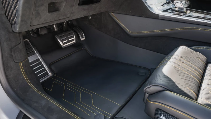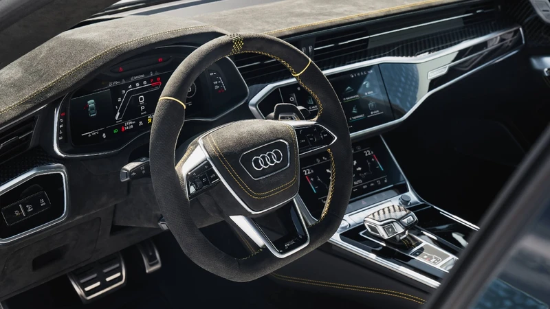 Por su parte, al interior del RS7-LE podemos aprecia el color negro con acentos en amarillo, las perforaciones entre dos franjas de Alcantara en el revestimiento del techo y costuras dobles en las puertas.