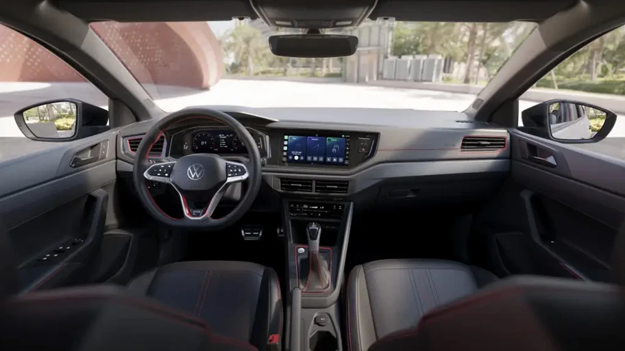 Por dentro Virtus monta asientos de corte deportivo, volante, ventilas y consola central con acentos de color rojo, pantalla táctil de10” compatible con Apple CarPlay y Android Auto, a/c automático, cuadro de instrumentos digital, paletas detrás del volante en simulación de aluminio, entre otros.