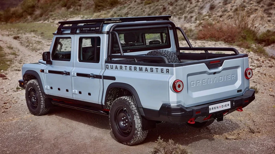 El Grenadier Quartermaster se distingue por su construcción de chasis de largueros, carrocería de acero galvanizado y ejes rígidos Carraro en ambos extremos, elementos poco comunes en pickups modernas. A ello se suma una suspensión de muelles reforzada, una caja de transferencia con dos velocidades, bloqueo de diferencial central y placas protectoras.