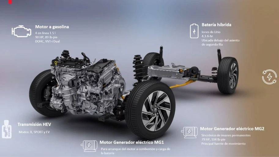 El nuevo Toyota Yaris Sedán HEV 2026 recurre a un sistema híbrido autorrecargable de cuarta generación, compuesto por un motor a gasolina de 1.5 litros con 90 hp y 89 lb-pie de torque, junto a un motor eléctrico síncrono MG2 de imanes permanentes que genera 79 hp y 104 lb-pie. La potencia combinada alcanza 110 hp, gestionados por una transmisión CVT con siete velocidades simuladas y modos de manejo Sport y EV.