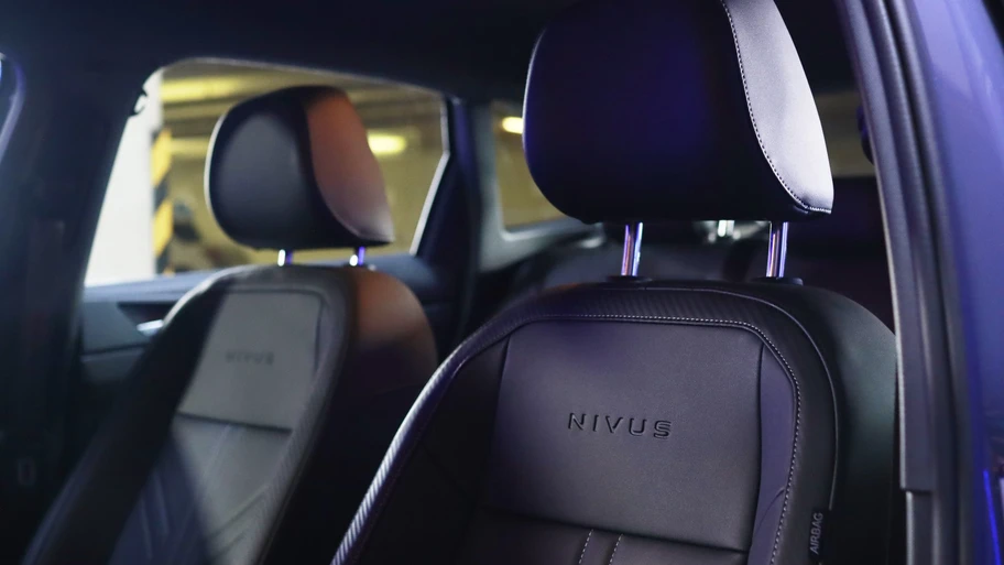 Entrando al habitáculo del Nuevo Nivus nos salta de primera vista uno de los cambios más notorios: los asientos, que tiene un diseño nuevo, más deportivo y con la palabra Nivus grabada en el respaldo.