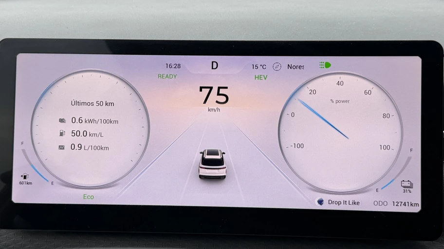 Pasando Saltillo nos llegó el momento ideal, largos descensos en la Sierra Madre y con ello kilómetros y kilómetros de modo EV, lo que hizo que nuestro promedio de consumo de gasolina se elevara a 50 km/litro, incrementando la capacidad también de regeneración de electricidad y dejando, por varios minutos un cálculo de consumo de 900 mililitros de gasolina cada 100 kms.