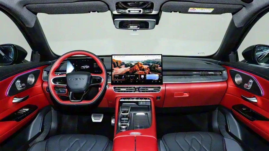 El interior incluye un volante de tres brazos, cuadro de instrumentos digital de 10.25 pulgadas y una pantalla central flotante de 15.6 pulgadas. El selector de cambios es electrónico y el habitáculo combina tonos en negro con detalles en rojo. El resultado final es bastante atractivo.
