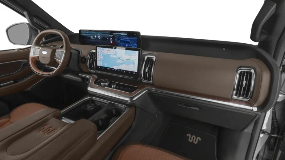 La nueva Ford Expedition King Ranch 2026 se distingue por una parrilla única con insertos en color bronce, rines de aluminio de 22 pulgadas con acabados en el mismo tono y los emblemáticos gráficos y distintivos "King Ranch" distribuidos en la carrocería. Además, cuenta con detalles funcionales de alto nivel, como estribos eléctricos, iluminación 360° y faros delanteros y traseros LED con marco satinado.