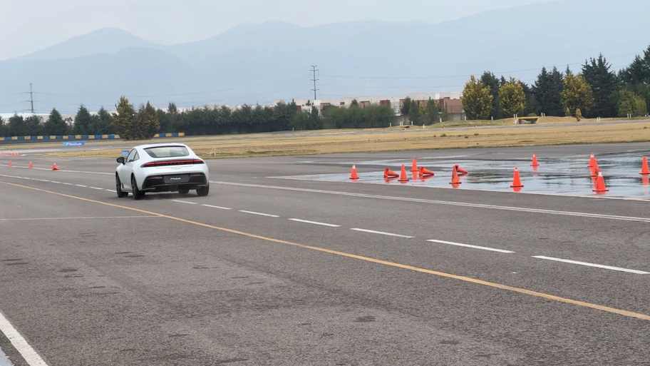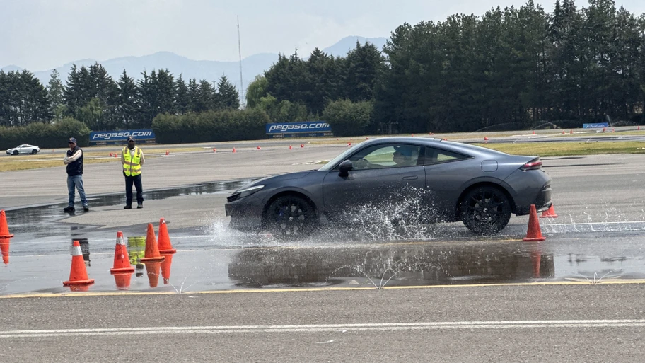 Después de ello, fue momento de tomar la pista. Primero, una aceleración a fondo nos llevó hasta una prueba del alce (cambio de carril de emergencia, sin frenar) en una plancha de concreto mojado, para tener muy baja adherencia. Tras ello, pasamos por un slalom y luego, una pequeña aceleración, curva cerrada a la derecha y otro largo tramo a fondo.