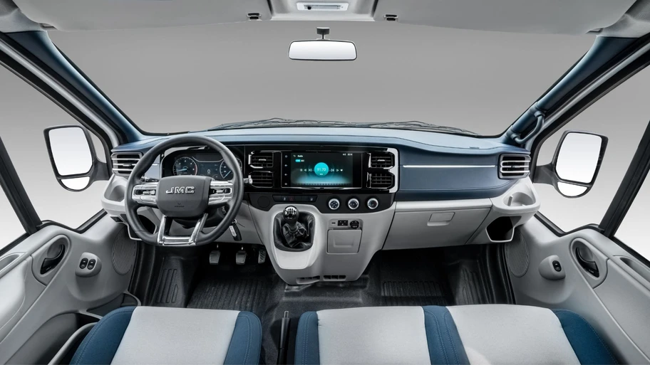 La JMC Touring Van se presenta como una herramienta de trabajo. Mecánicamente, confía en un motor de 2.0 litros turbodiésel Euro VI que entrega 143 HP y un torque de 262 lb-pie, acoplado a una transmisión manual de seis velocidades proporcionada por Magna.