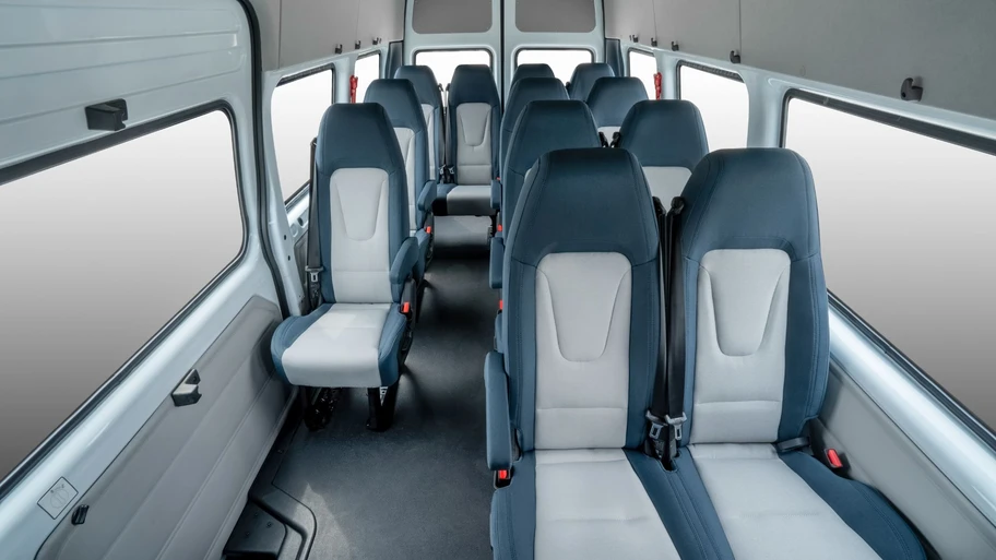 Por otro lado, la JMC Touring Bus está diseñada para el transporte de personas. Esta versión ofrece una capacidad de hasta 15 asientos con una distribución inteligente de 3/2/3/3/4. El interior cuenta con tapicería en tela de alta resistencia, descansabrazos para los asientos traseros (excepto en la última fila) y salidas de aire acondicionado específicas para la zona de pasajeros.