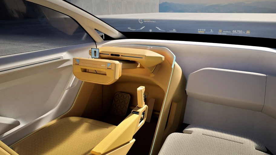 Mientras que el pasajero se coloca en un asiento estructuralmente distinto, permitiendo una postura más relajada, con un soporte para las piernas y una configuración que lo deje disfrutar del contenido multimedia que se proyecta en el parabrisas. Este asiento también puede girar 180 grados, para poder quedar de frente a los pasajeros traseros y que puedan tener una charla.